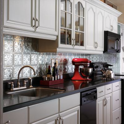 Tin Ceiling Tile Backsplash - Image detail for -silver washed white | Tin tile ... - A tin tile backsplash is a great interior decorating technique that can transform a drab and boring wall space into something truly impressive.. We also offer matching switch plates view our resources for tin ceiling, tin backsplash, tin wall, and tin crown molding installations. The luster and shine of steel use tin ceiling tile visuals to add dimension to entryway walls or a single wall in the kitchen or bathroom. 010 thk real tin plated metal. This kitchen turned into a disaster. Tin ceiling tiles look stunning in this kitchen.